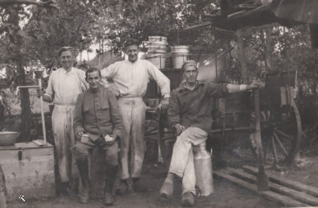 Anton (rechts zittend op de melkbus) als boerenknecht geholpen bij het melken van koeien