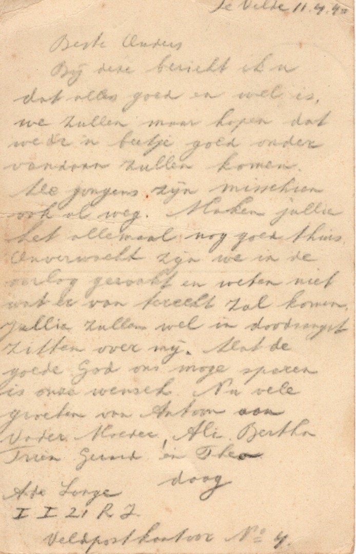 Jullie zullen wel in doodsangst zitten over mij. Dat de goede god ons moge sparen is onze wens. Nu vele groeten van Anton aan vader moeder, Ali Bertha Trien Gerrit en Theo