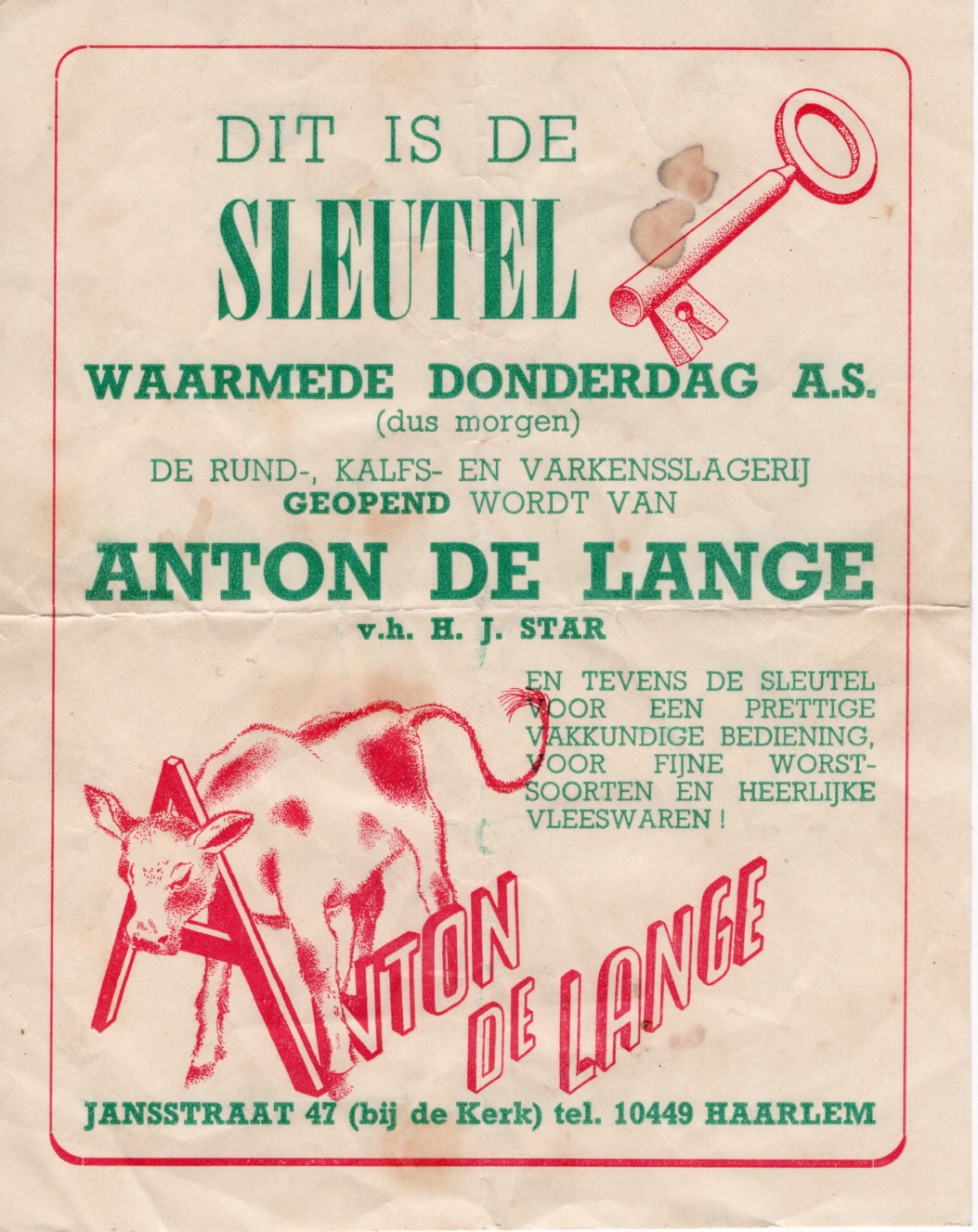 Anton is altijd als slager blijven werken en xx-xx-19xx is hij voor zichzelf begonnen in de St. Jansstraat in Haarlem